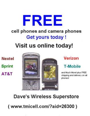 FREE cell phones and camera phones! Visit us online today! Get a FREE BlackBerry Wireless or one of many Wireless cell phones! Don't wait! (www.tmicell.com/?aid=26300) Don't miss out! All of the major name brands including, Verizon,Sprint,at&t,T-Mobile and much more!! |
